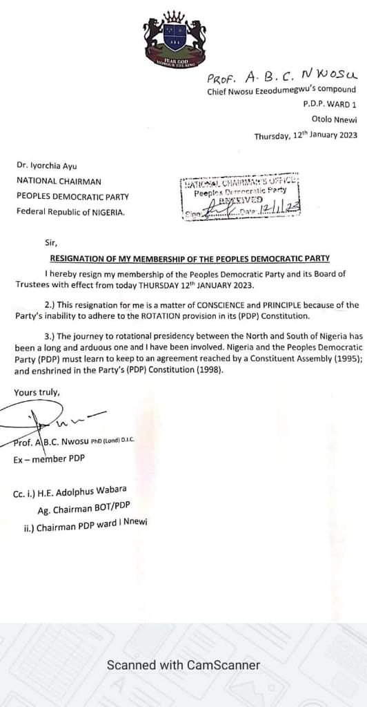 A prominent member of the Peoples Democratic Party (PDP) Board of Trustees, Professor ABC Nwosu, has resigned his membership from the party.