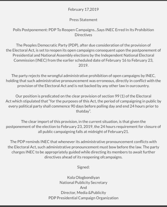 Polls Postponement: The PDP after due consideration of the provision of the Electoral Act, is set to reopen its open campaigns consequent upon the postponement of Presidential and Senate elections by INEC from the earlier scheduled date of Feb. 23, 2019.