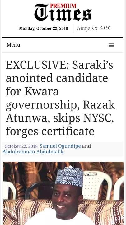 The governorship candidate of the Peoples Democratic Party in Kwara State in the forthcoming general elections, Razak Atunwa, did not participate in Nigeria’s compulsory national youth service scheme, PREMIUM TIMES can authoritatively report today.