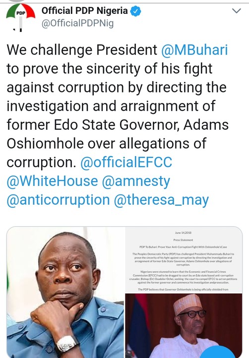 @OfficialPDPNig: Nigerians were stunned to learn that the @officialEFCC had to be dragged to court by an Edo state based anti-corruption crusader, (Dr) Osadolor Ochei, seeking the court to compel EFCC to act on petitions against the former governor and commence his investigation and prosecution.