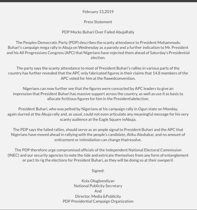 APC Abuja Rally: The scanty attendance to President Buhari’s campaign mega rally in Abuja on Wednesday is a parody and a further indication to Mr. President and his failed APC that Nigerians have rejected them ahead of Saturday’s Presidential election.