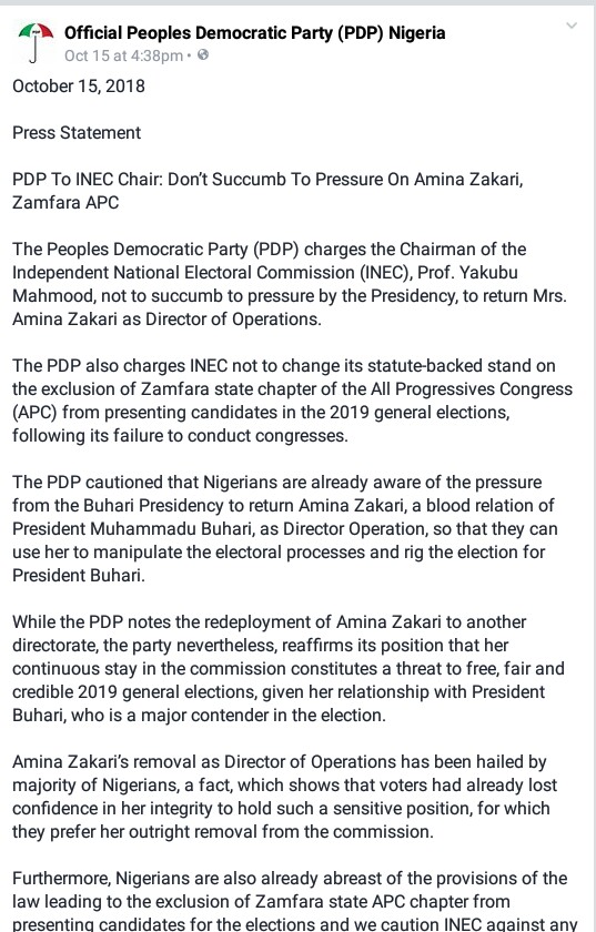 While the PDP notes the redeployment of Amina Zakari to another directorate, the party nevertheless, reaffirms its position that her continuous stay in the commission constitutes a threat to free, fair and credible 2019 general elections, given her relationship with President Buhari, who is a major contender in the election.
