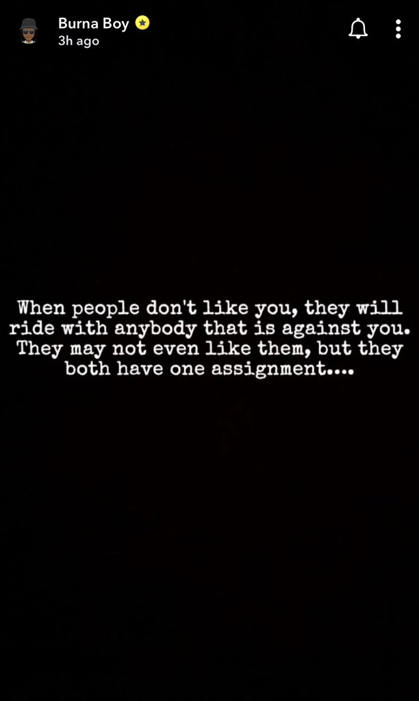 Burna Boy noted how people will ride with those against you when they don’t like you.