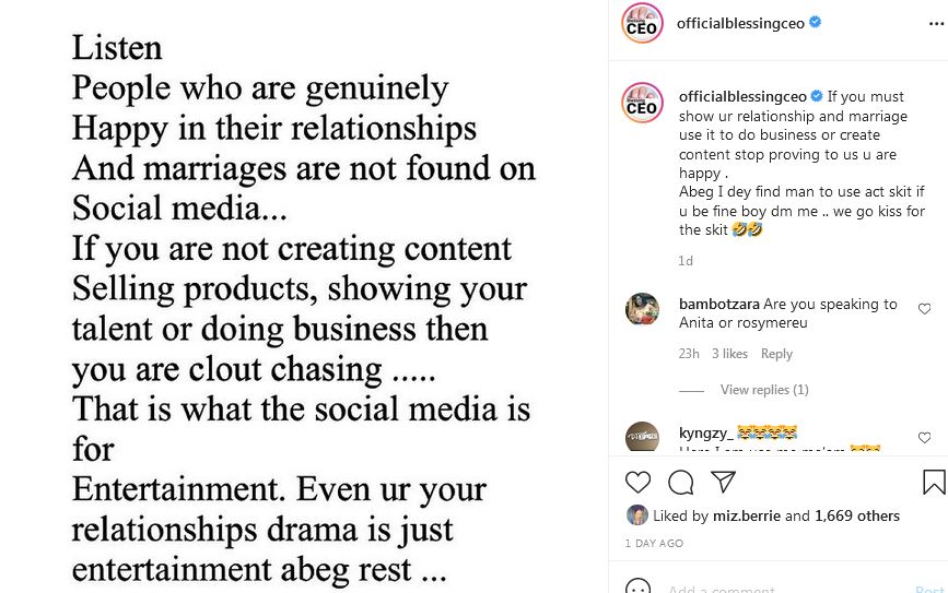 Controversial relationship blogger, Blessing Okoro, has said that people who are genuinely happy in their relationships and marriages are not on social media.