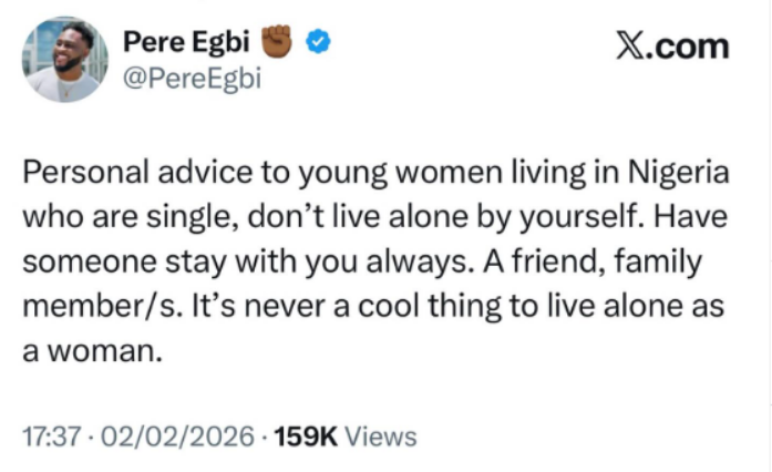 BBNaija’s Pere Egbi, is of the opinion that single women should never live alone in Nigeria. According to him, single women particularly in Nigeria need to have someone, a friend or family member, live with them. He opined that it is not cool for a woman to live alone. His post on X reads