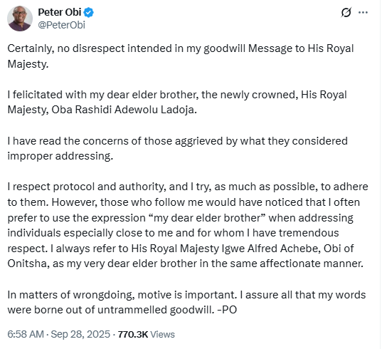 Peter Obi has responded to Nigerians who on Saturday, September 28, criticized him over the goodwill message he posted online congratulating the Olubadan of Ibadan Oba Rasheed Ladoja.