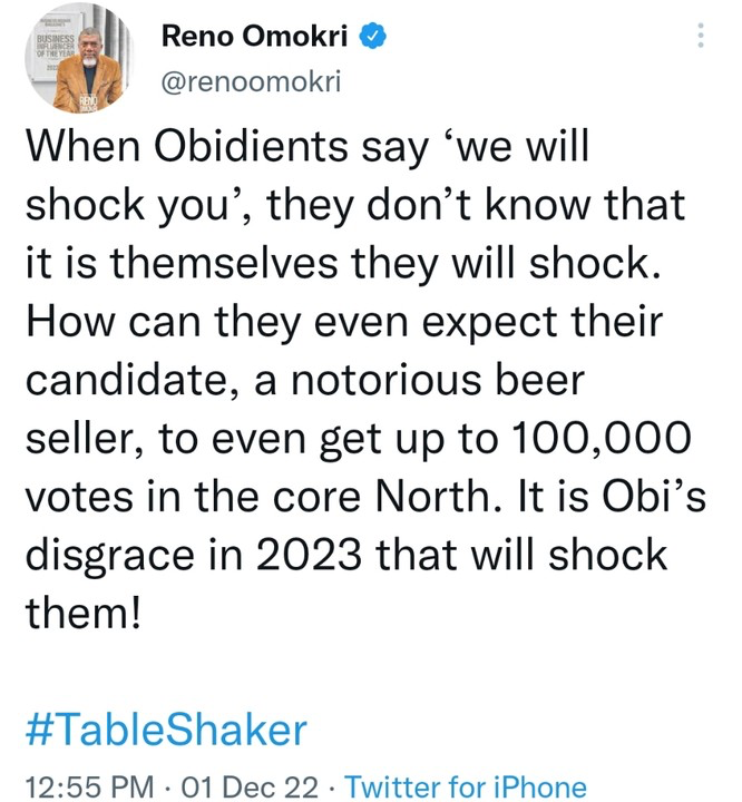 When Obidients say ‘we will shock you’, they don’t know that it is themselves they will shock. How can they even expect their candidate, a notorious beer seller, to even get up to 100,000 votes in the core North. It is Obi’s disgrace in 2023 that will shock them!