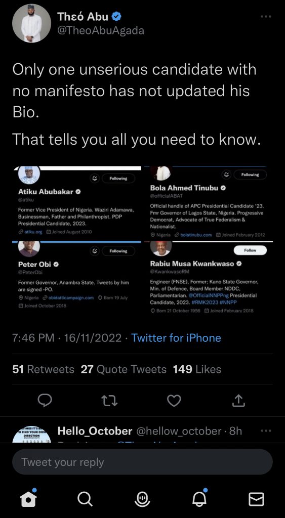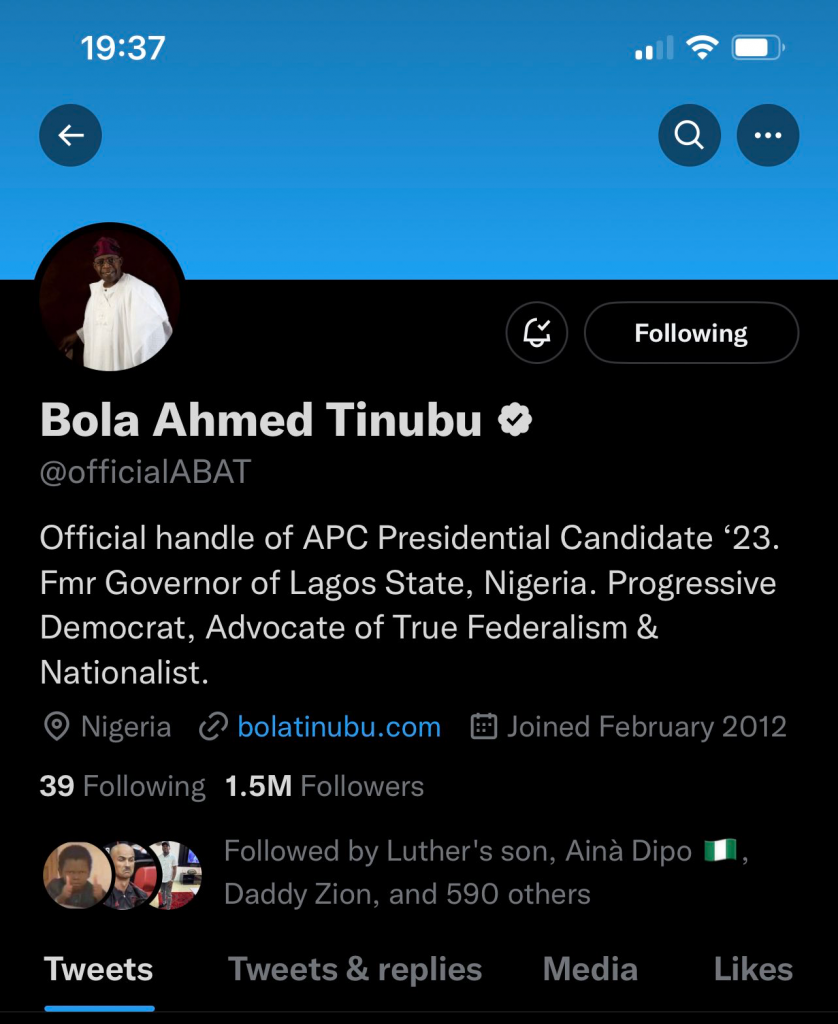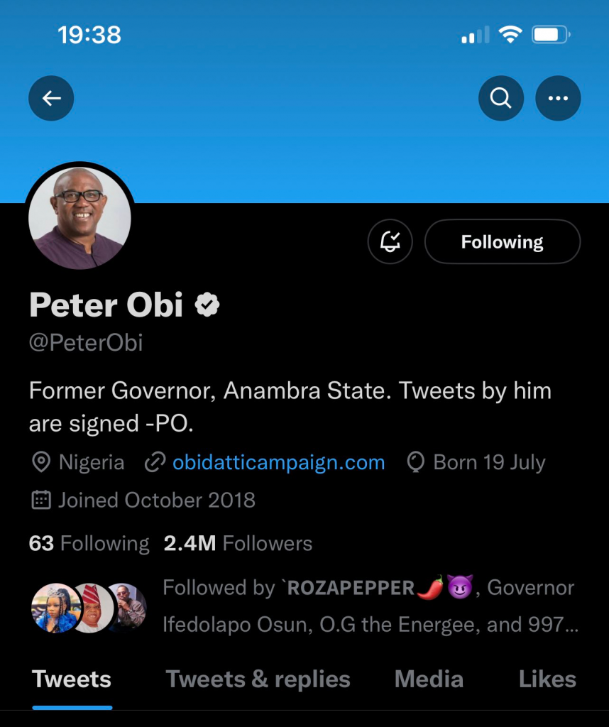 Peter Obi’s Twitter Bio Does Not Reflect His Presidential Candidacy