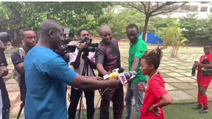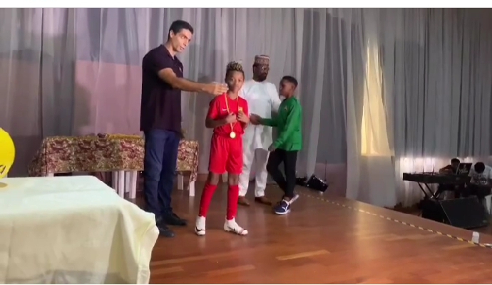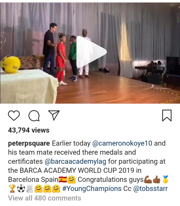 Nigerian musician, Peter Okoye celebrates with his son, Cameron after him and his team mates receives medals for participating at the Barca Academy World cup in Barcelona, Spain.