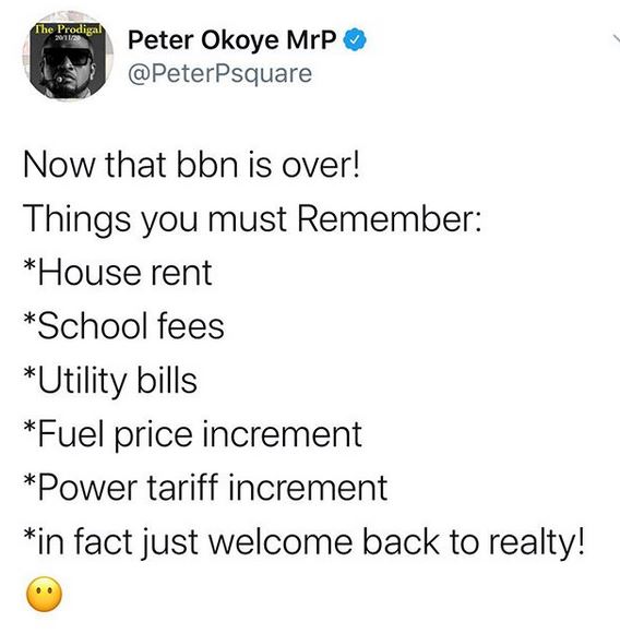 Peter Psquare Remind Nigerians Of Their Harsh Reality Now That BBN Is Over