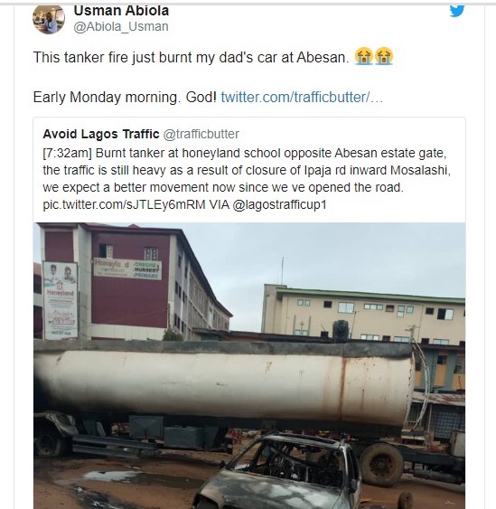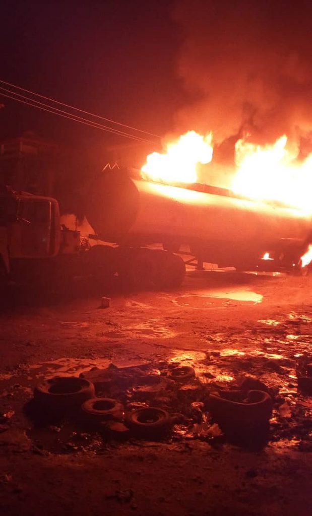A petroleum tanker loaded with 33,000 litres Premium Motor Spirit, PMS, is currently burning at the entrance of Gowon Estate, Ipaja Road, Alimosho, Lagos.