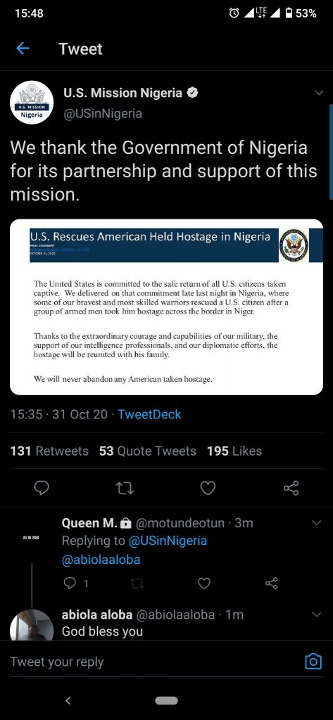 Trump further announced in a tweet; “Last night our country’s brave warriors rescued an American hostage in Nigeria. Our nation salutes the courageous soldiers behind the daring nighttime rescue operation and celebrates the safe return of yet another American citizen.”