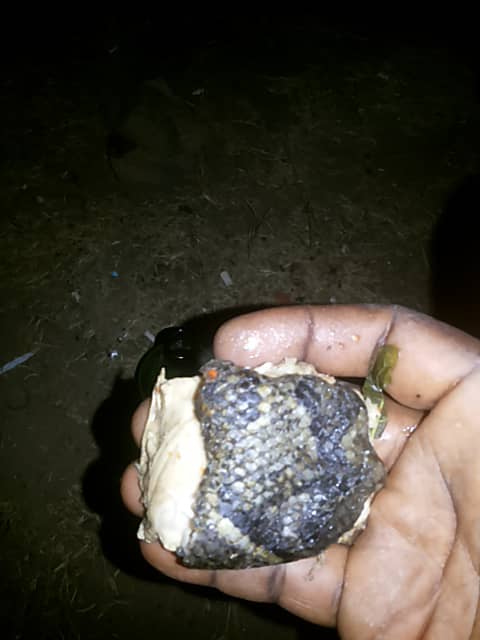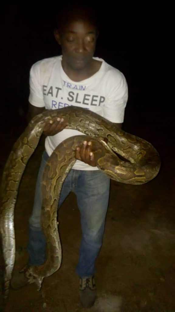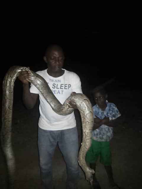Before this snake was killed, a big block was hit on the head and the killer picked race. It was staggering and it fell down a tree , was unconscious and finally killed.