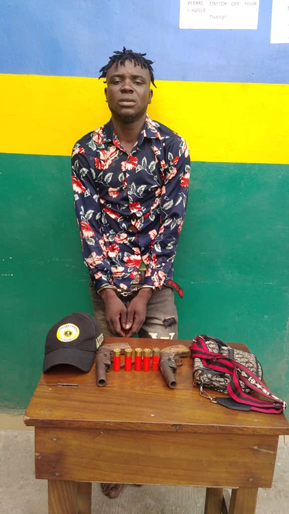 The men of the Lagos state police command have arrested an armed robbery suspect with two locally-made pistols and five live cartridges concealed in a bag.