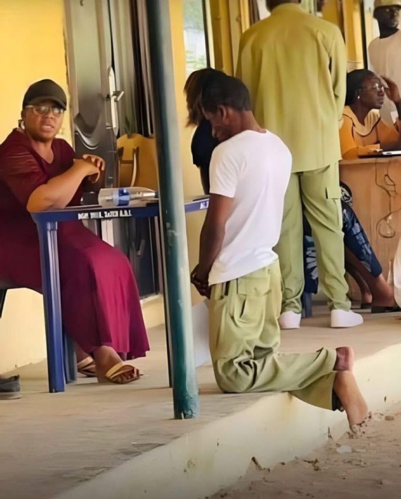 The internet is on fire after a controversial photo surfaced online showing a male National Youth Service Corps (NYSC) member kneeling before his Local Government Inspector (LGI), who happens to be a woman. The viral image has triggered widespread outrage, with many Nigerians condemning what they describe as intimidation and oppression under the guise of discipline.