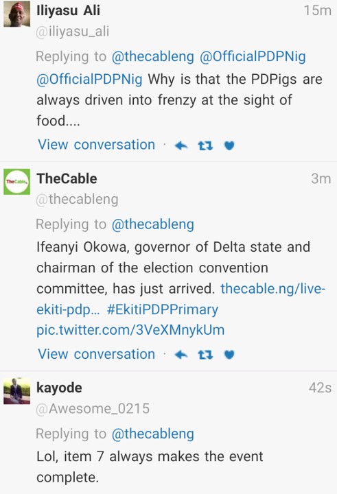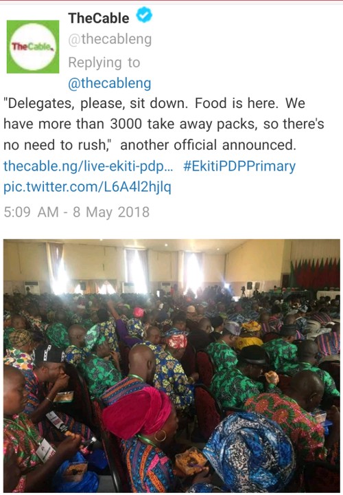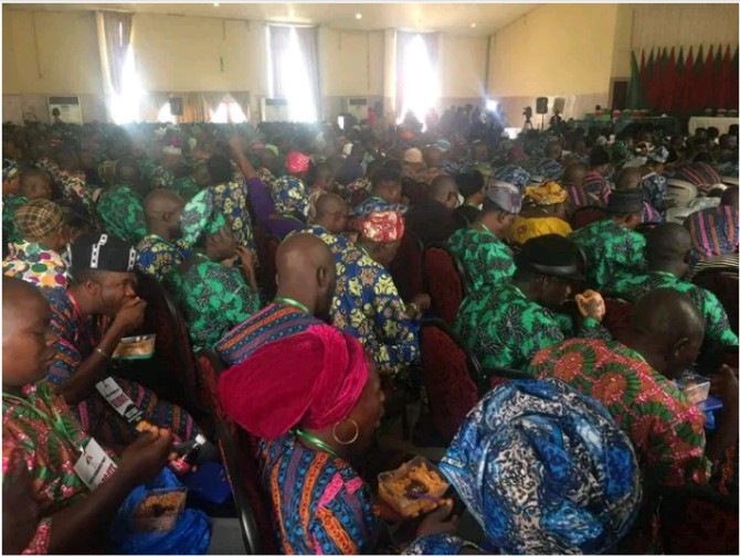 “Delegates, please, sit down. Food is here. We have more than 3000 take away packs, so there’s no need to rush,” another official announced. credit :@thecableng.