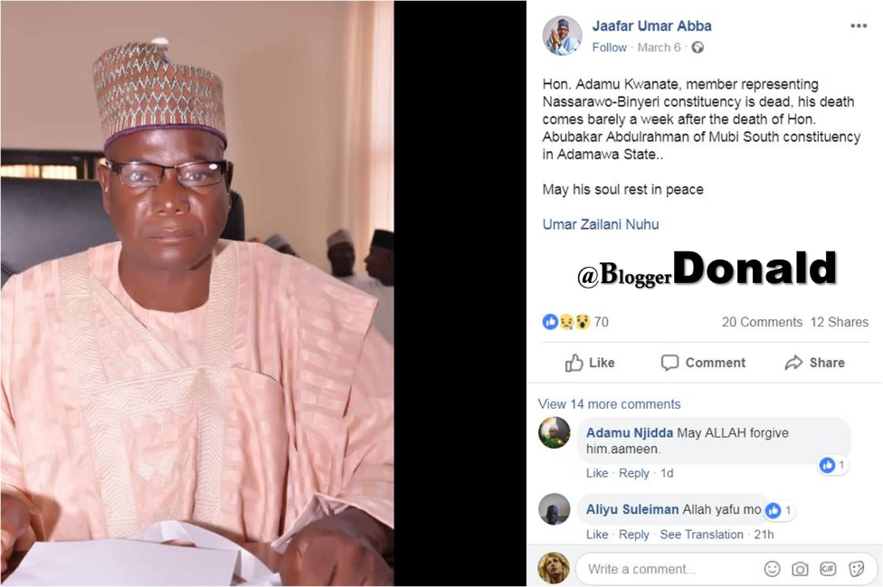 .Hon. Adamu Kwanate, member representing Nassarawo-Binyeri constituency is dead, his death comes barely a week after the death of Hon. Abubakar Abdulrahman of Mubi South constituency in Adamawa State..