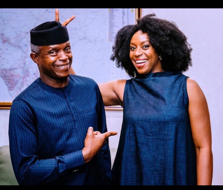 Vice president of the federal republic of Nigeria, Professor Yemi Osibanjo meets with multiple award winning international writer Chimamanda Ngozi Adichie as they both pose for the camera .