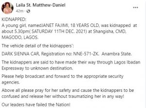 It has been reported that a 19-year-old girl who was identified as Janet Fajimi, has been kidnapped in Lagos.