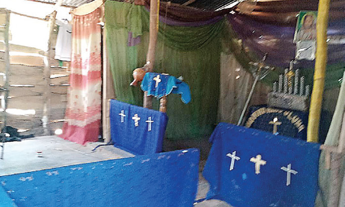 The church ’ s altar is decorated with blue clothing marked with signs of the cross painted white. The roof is made of zinc and fortified within with woods. There ’ s also a makeshift room close to the altar partitioned with apparels of many hues .