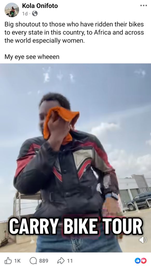 He had made a post on Facebook on Sunday, March 1, announcing that he was going on his first solo trip on his motorcycle out of Lagos and he’s headed to Akure.  That was his last post.
