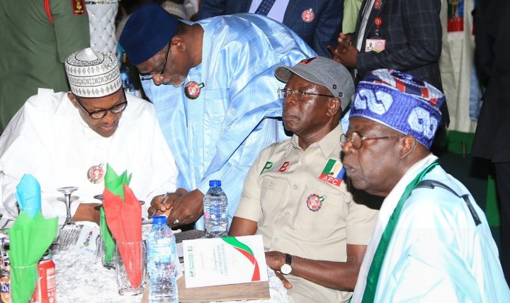 In attendance are Bola Tinubu, co-chairman of the campaign council, and Adams Oshiomhole, the APC national chairman.
