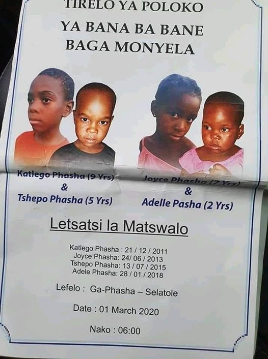 The bodies of the siblings, Katlego Phasha 9, Joyce Phasha 7, Tshepho Phasha 5 and Adel Phasha 2, were found with multiple injuries in the bushes around the area. The children were brutally murdered by their father, 50-year-old Lucas Phasha after he accused their mother of infidelity.