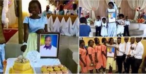 In photos shared on Facebook, the lady could be seen holding the man’s photo all through the wedding occasion.
