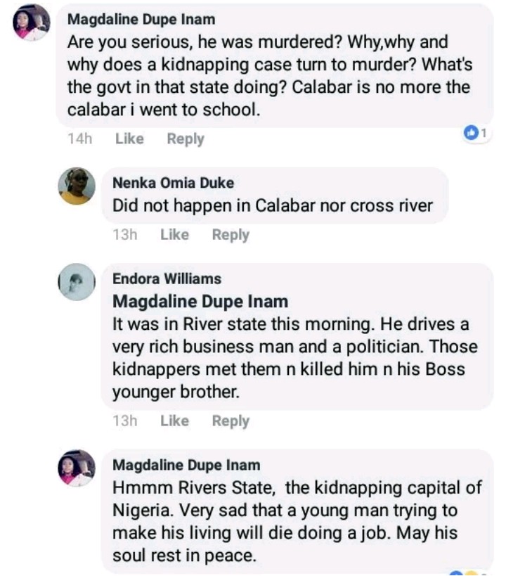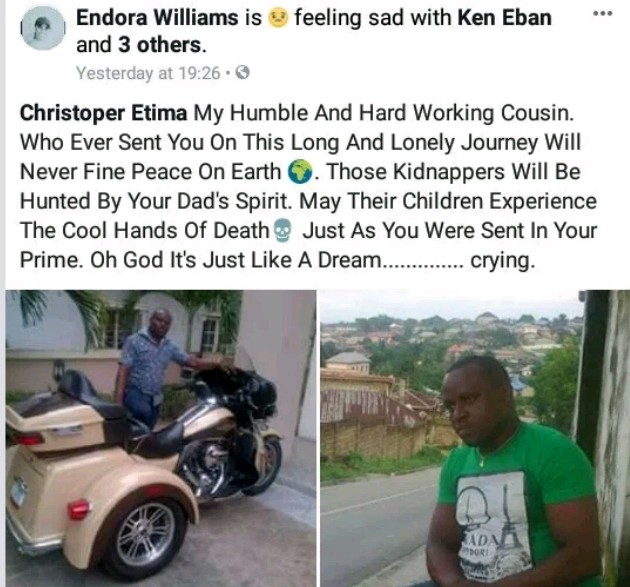 “Christoper Etima My Humble And Hard Working Cousin. Who Ever Sent You On This Long And Lonely Journey Will Never Fine Peace On Earth . Those Kidnappers Will Be Hunted By Your Dad’s Spirit. May Their Children Experience The Cool Hands Of Death Just As You Were Sent In Your Prime. Oh God It’s Just Like A Dream………….. crying.”