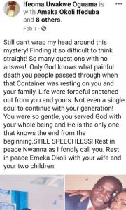 “Nigeria happened to us. Death did us dirty on Sunday at Ojuelegba lagos. Nnaa you went to church on Sunday with your family ,your wife prepared Sunday food that you guys will eat when you come back from church but life happens, death came and block your way from coming home alive. God we don’t need to question you ,but how I wish one person survived, it could have been better. Container loaded with goods decided to wipe away this lovely family. Rest in peace Bro and wify. Rest in people ifechukwu and chidobelu. God if it pleases you , we accept it by faith.”she added.