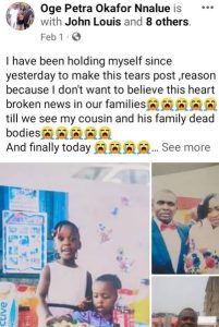 “I have been holding myself since yesterday to make this tears post, reason because I don’t want to believe this heart broken news in our families till we see my cousin and his family dead bodies. And finally today finally we confirm Emeka and his family are dead ,see them lying helplessly here at Mortuary In Yaba,” Oge Petra Okafor Nalue, wrote.