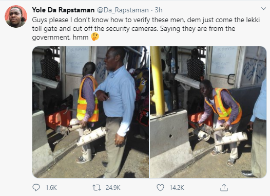 He wrote: “Guys please I don’t know how to verify these men, dem just come the lekki toll gate and cut off the security cameras. Saying they are from the government, hmm.”