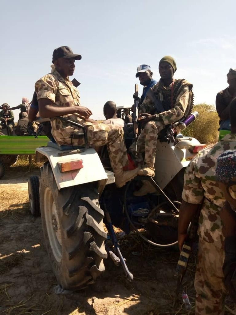 A Facebook user, Bello Inua Anka on Friday, December 11, posted photos of Nigerian soldiers guarding and assisting the people of Zabarmari farming community in Jere Local Government Area of Borno while harvesting their farms produce at Koshebe village.