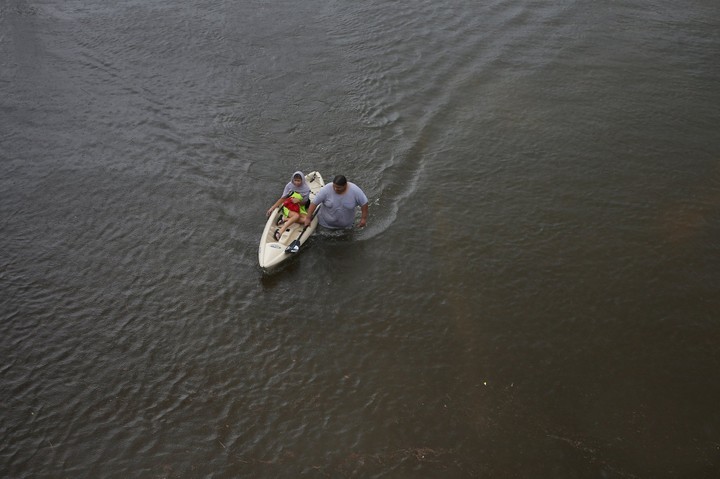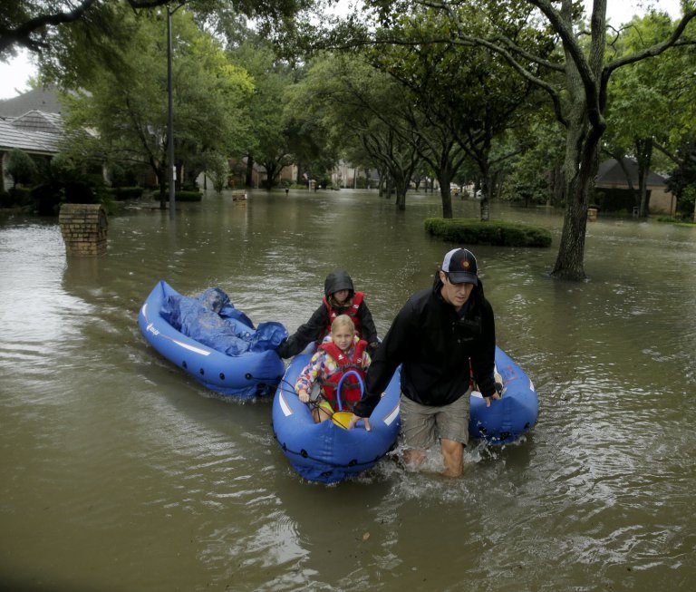 People evacuate a neighborhood inundated by floodwaters from Tropical Storm Harvey on Monday, Aug. 28, 2017, in Houston, Texas. (AP Photo/Charlie Riedel)