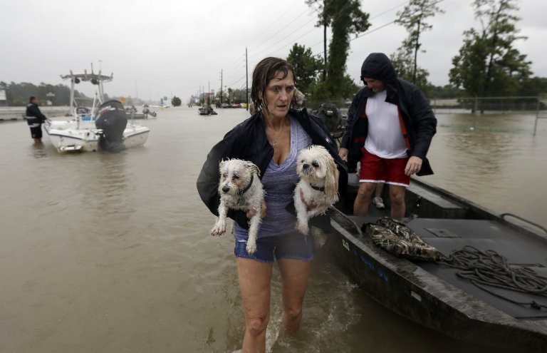 Belinda Penn holds her dogs Winston and Baxter after being rescued from their home as floodwaters from Tropical Storm Harvey rise Monday, Aug. 28, 2017, in Spring, Texas. (AP Photo/David J. Phillip)