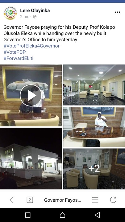 Just few months for the incumbent Governor of Ekiti state, Dr Peter Fayose to leave office and hand over to the next candidate to win the July 14 governor ship election. The Governor newly built a luxurious office at the state capital Ado ekiti which we saw handling to his deputy Prof. Olusola Kolapo (Pdp flag bearer).