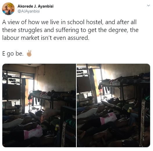 Sharing the photos, student Akorede Ayanbisi wrote: “A view of how we live in school hostel, and after all these struggles and suffering to get the degree, the labour market isn’t even assured. E go be.”