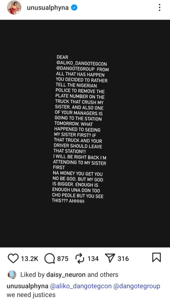 “DEAR @ALIKO_DANGOTEGCON @DANGOTEGROUP FROM ALL THAT HAS HAPPEN YOU DECIDED TO RATHER TELL THE NIGERIAN POLICE TO REMOVE THE PLATE NUMBER ON THE TRUCK THAT CRUSH MY SISTER. AND ALSO ONE OF YOUR MANAGERS IS GOING TO THE STATION TOMORROW. WHAT HAPPENED TO SEEING MY SISTER FIRST? IF THAT TRUCK AND YOUR DRIVER SHOULD LEAVE THAT STATION!!! I WILL BE RIGHT BACK I’M ATTENDING TO MY SISTER FIRST NA MONEY YOU GET YOU NO BE GOD. BUT MY GOD IS BIGGER. ENOUGH IS ENOUGH UNA DON TOO CHO PEOLE BUT YOU SEE THIS??? AHHHH”