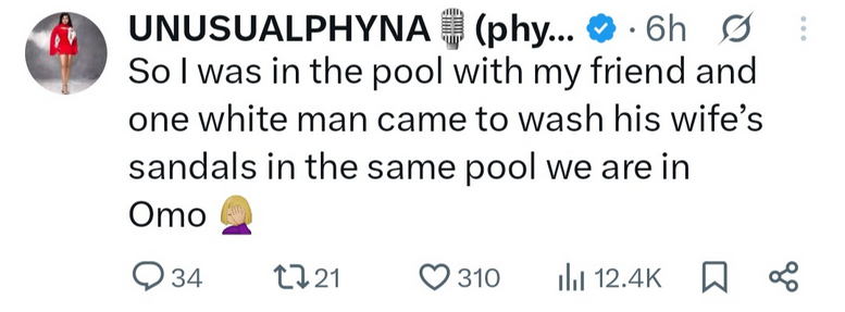 The former Big Brother Naija winner took to X to write: “So I was in the pool with my friend and one white man came to wash his wife’s sandals in the same pool we are in. Omo.”