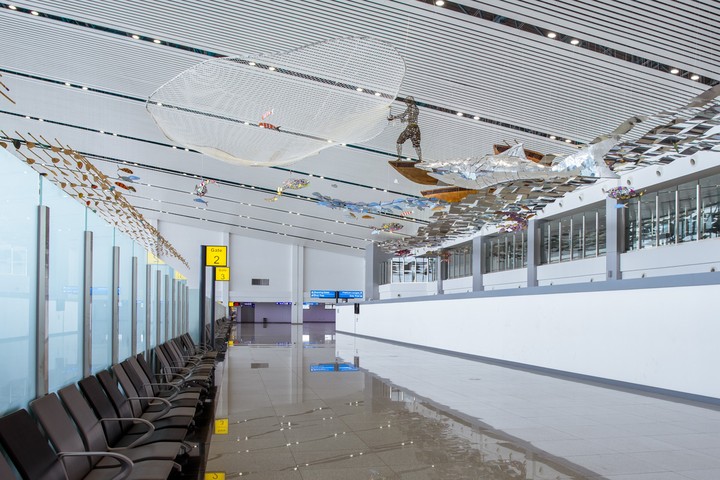The Floating Fisherman, one of Nigeria’s largest art installations ever, overlooks the executive lounge of the airport. The art installation is suspended 20ft in the air featuring over 700 canoe paddles, 3 lifesize boats, a 9ft fisherman casting a fishing net the size of a volleyball court, and a school of fishes swimming with a 20ft silver shark. The installation mirrors real sea life and it is an allusion to a favorite pastime of Riverians which is fishing.