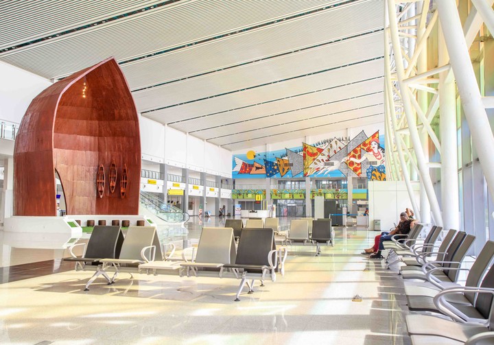is an exaggerated life-sized boat that celebrates a lifestyle predominant in Rivers State. The boat also serves as a thoroughfare in the Departure terminal of the airport, and also a temporary seating area with movable furniture provided around its perimeter.