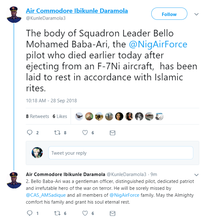 Bello Mohamed Baba-Ari, the Nigeria Airforce pilot who died earlier today after ejecting from an F-7Ni aircraft, has been laid to rest in accordance with Islamic rites.