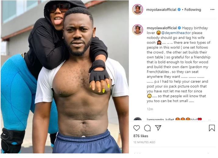 “Happy birthday lover 😛@deyemitheactor please nobody should go and tag his wife oooh 🙈….. … … there are two types of people in this world ( one set follows the crowd, the other set builds their own table ) so grateful for a friendship that is bold enough to look for wood and build their own darn (pardon my French) tables, so they can seat anywhere they want …….. ……… ……… …….. p.s I had to help your career and post your six-pack picture oooh that you have not let me rest for since 🙄…… so that people will know that you too can be hot small”.