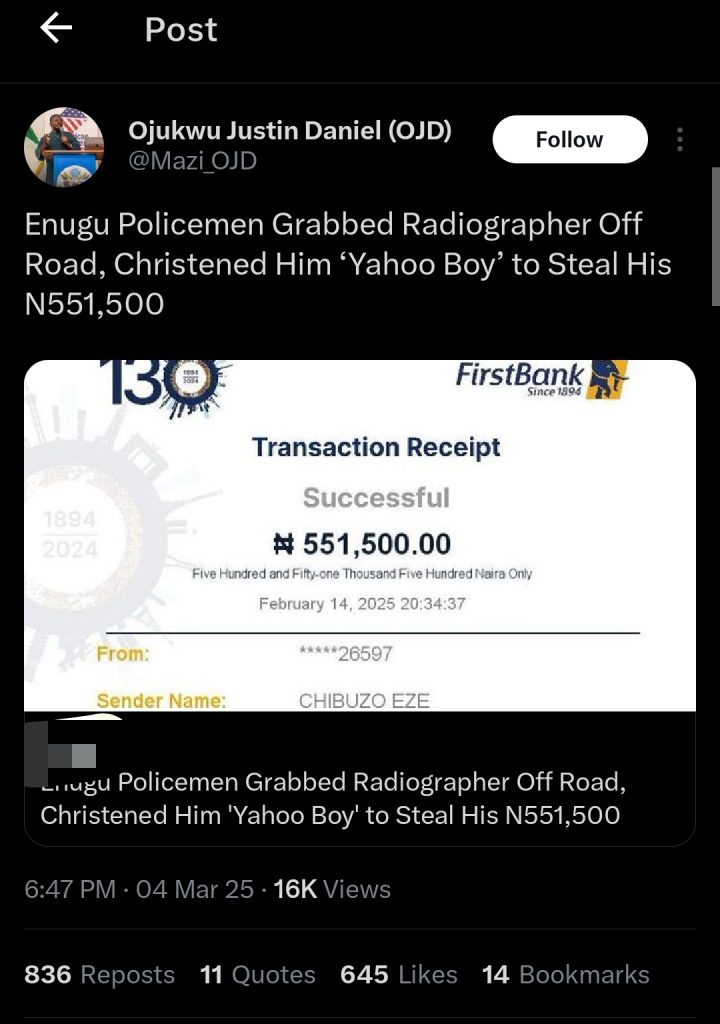 According to @Mazi_OJD, the victim’s brother reached out to narrate how his brother, a medical radiographer, was forcefully picked up by some police officers in Enugu. They reportedly labelled him a yahoo boy without evidence.