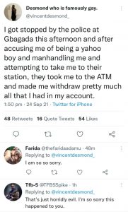 “I got stopped by the police at Gbagada this afternoon and after accusing me of being a yahoo boy and manhandling me and attempting to take me to their station, they took me to the ATM and made me withdraw pretty much all that I had in my account.”