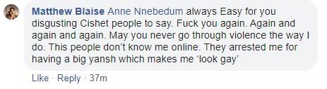 “…always Easy for you disgusting Cishet people to say. Fuck you again. Again and again and again. May you never go through violence the way I do. This people don’t know me online. They arrested me for having a big yansh which makes me ‘look gay’” he said while replying a comment.