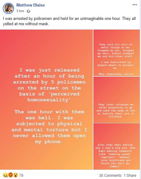 A Nigerian man, Matthew Blaise has accused police officers of arresting him for having a big nyash. The effeminate man shared his sad ordeal on Facebook.