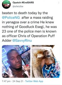 “Beaten to death today by the @PoliceNG after a mass raiding in yenagoa over a crime He knew nothing of. Goodluck Esegi, he was 23. One of the police men is known as officer Chris of Operation Puff Adder.”