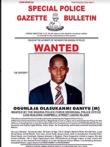 The Nigerian Police force has declared nine bankers wanted for stealing various amount of money from depositors of a new generation bank, the police acted on petitions it received from the bank and its customers on the disappearance of a large sum of money from their various accounts.