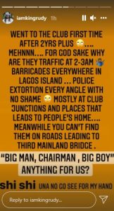 Nigerian singer, Paul Okoye popularly known as Rudeboy has accused policemen of causing traffic on the Island by 2 am to beg money from motorists.